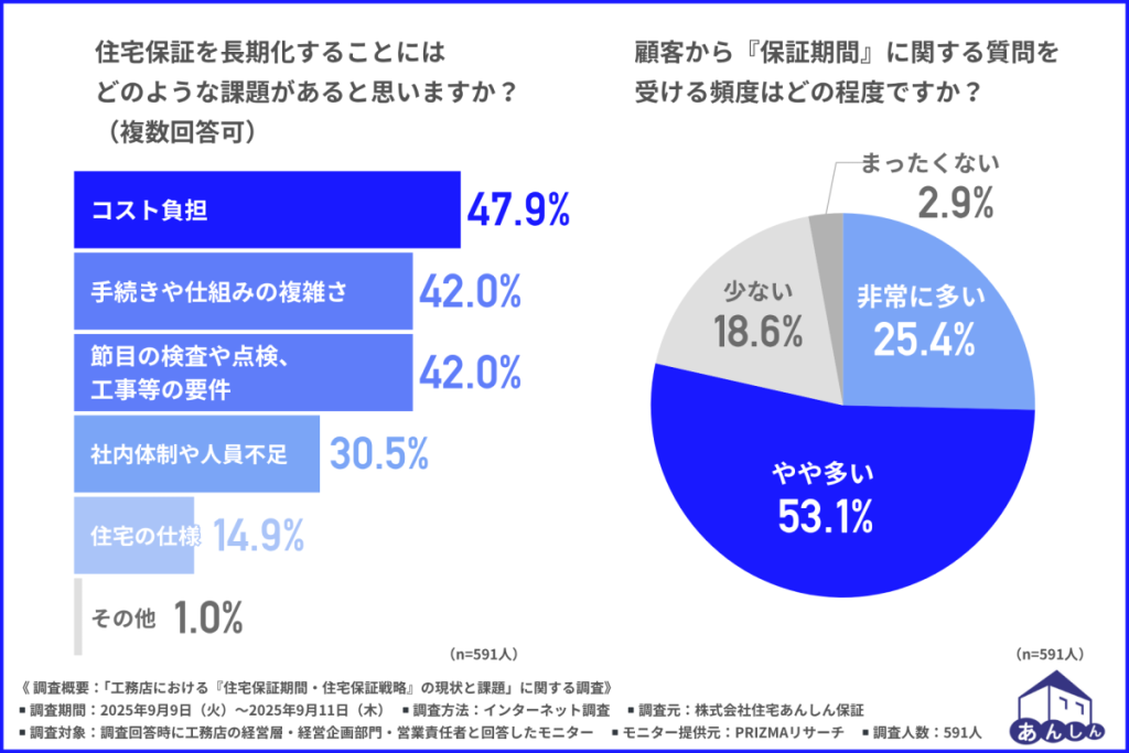 一方、顧客の関心は確実に高まっている。「保証期間に関する質問を受ける頻度」は、「非常に多い」25.4%、「やや多い」53.1%で、約8割が“保証について問われることが多い”と回答した。需要が高まる中、現場の負担をいかに軽減し、持続可能な仕組みとして保証を運用できるかが、今後の競争力を左右する鍵となるだろう。