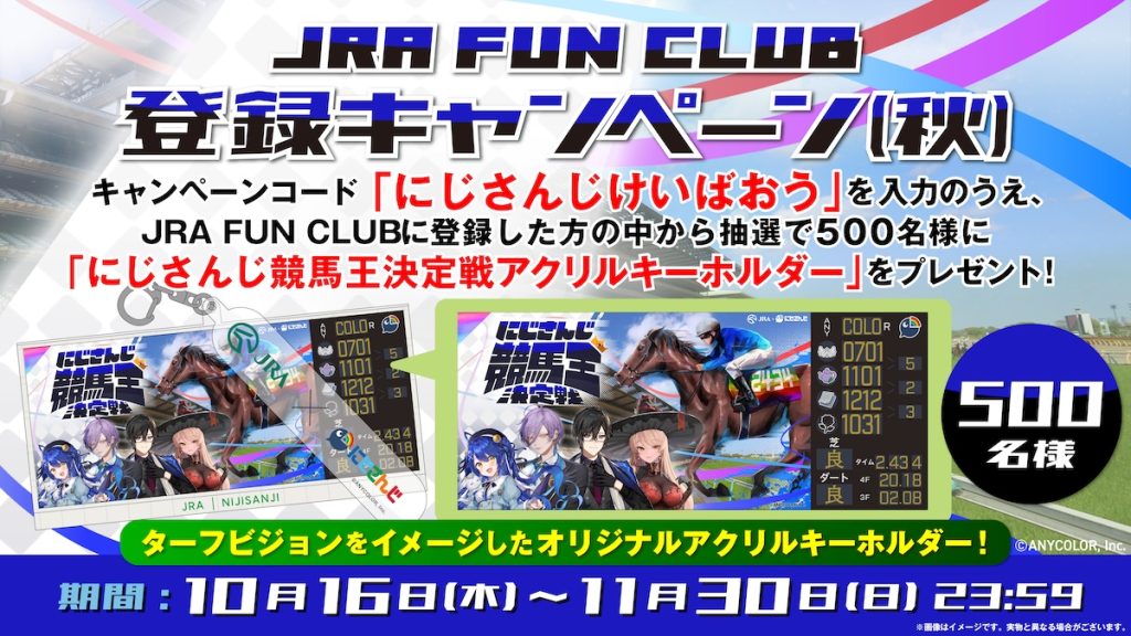 JRA FUN CLUB に登録した人の中から抽選で、500名に「にじさんじ競馬王決定戦アクリルキーホルダー」をプレゼント!