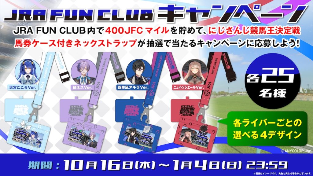 JRA FUN CLUB 内のコンテンツで獲得できるJFCマイルを400マイルためると応募できるキャンペーン。応募者の中から抽選で、計100名(25名×4種)に「にじさんじ競馬王決定戦 馬券ケース付きネックストラップ」をプレゼント!