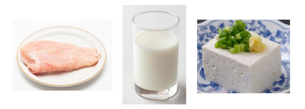 たんぱく質を多く含む食材:鶏むね肉、牛乳、豆腐