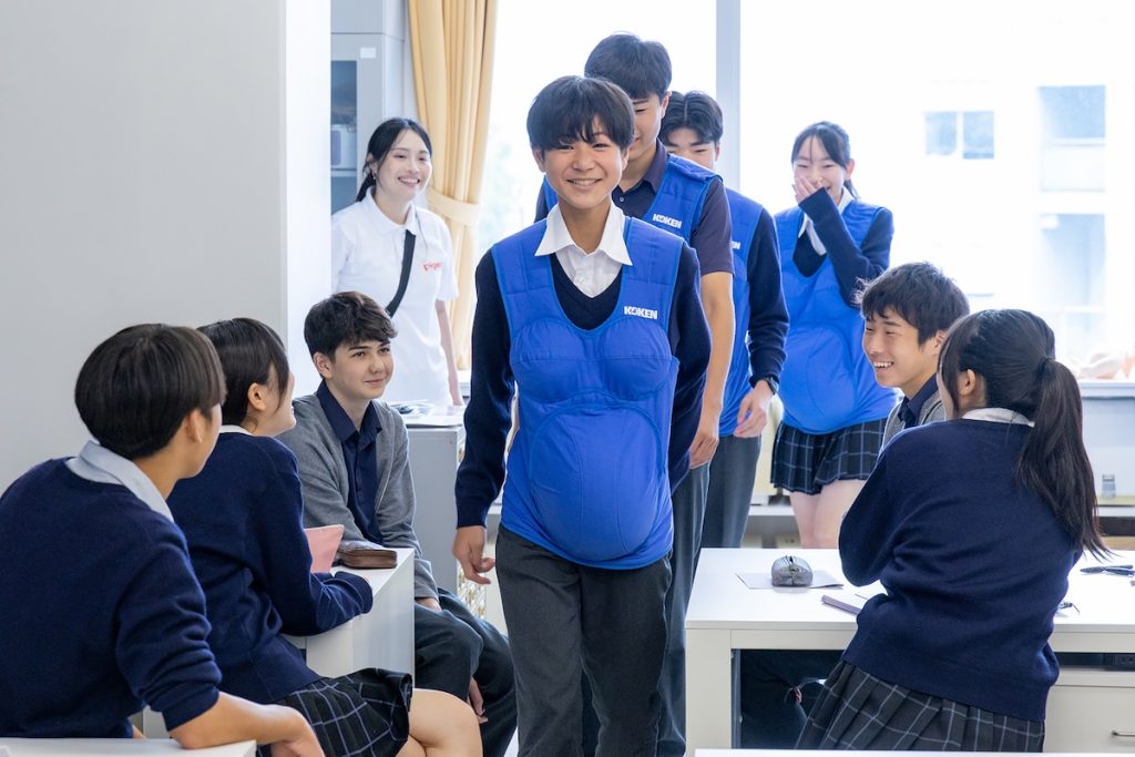 妊婦ジャケットの体験では、着るだけでなく、そのまま教室を実際に歩くなど、妊娠した状態で外出するママの感覚を、生徒たちは疑似体験した。妊婦ジャケットを着た生徒たちは「想像以上に重かった」「お腹を支えながら歩くのは大変」と言い、育児への理解を深めた。