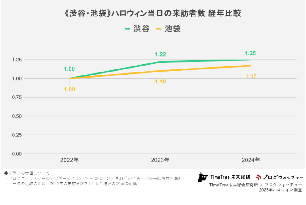 ブログウォッチャーの人流データを用いて、渋谷と池袋の2023年および2024年のハロウィン当日の来訪者数を比較した結果、新型コロナウイルスが5類感染症に移行した2023年には、渋谷が122%、池袋が110%とそれぞれ増加を記録。2024年になると池袋は2022年比117%とさらなる伸びが見られたのに対し、渋谷は3%の微増と、池袋と比較してやや伸びが鈍化していたことが見てとれた。