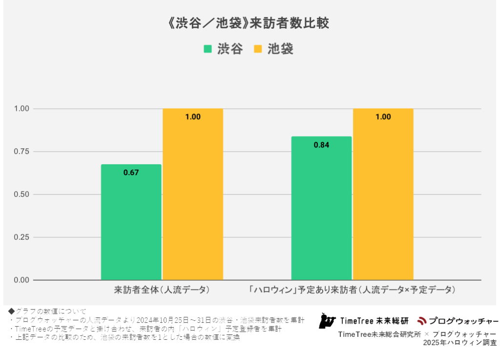 さらに、2024年のハロウィンウィーク(10/25~31)について、渋谷・池袋の来訪者数全体(ブログウォッチャーの「人流データ」のみから集計)と、渋谷・池袋それぞれで「ハロウィン」関連の予定がある来訪者(「人流データ×予定データ」の掛け合わせで集計)に絞ったデータを比較。その結果、人流データのみから見た2都市の来訪者数全体のデータでは、渋谷の来訪者数は池袋の約67%にとどまった。しかし、「ハロウィン」関連の予定がある来訪者においては、渋谷の来訪者数は池袋の約84%まで伸びていた。このことから、渋谷はハロウィン目的で来訪する割合が池袋より高く、近年ハロウィンイベントが盛り上がりを見せる池袋と比較しても根強い人気を持つことがわかった。