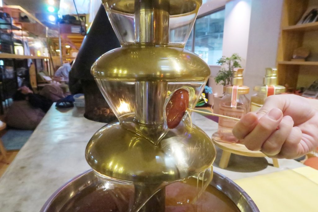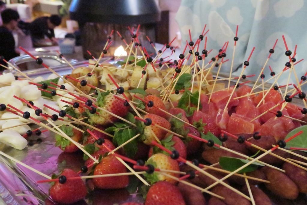 ファウンテンでは、イチゴやパイナップルなどの果物、バゲット、チーズなどの食材から3つ選び、流れるハチミツをたっぷりまとわせて味わうことができる。人気はやはりイチゴだが、意外な組み合わせとしてサツマイモが好評とのこと。