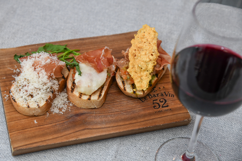 『16か月熟成グラナ・パダーノPDOチーズとフレッシュトマトのクロスティーニ』(869円)と『アバツィア プロセッコ ブリュット』(一杯869円)