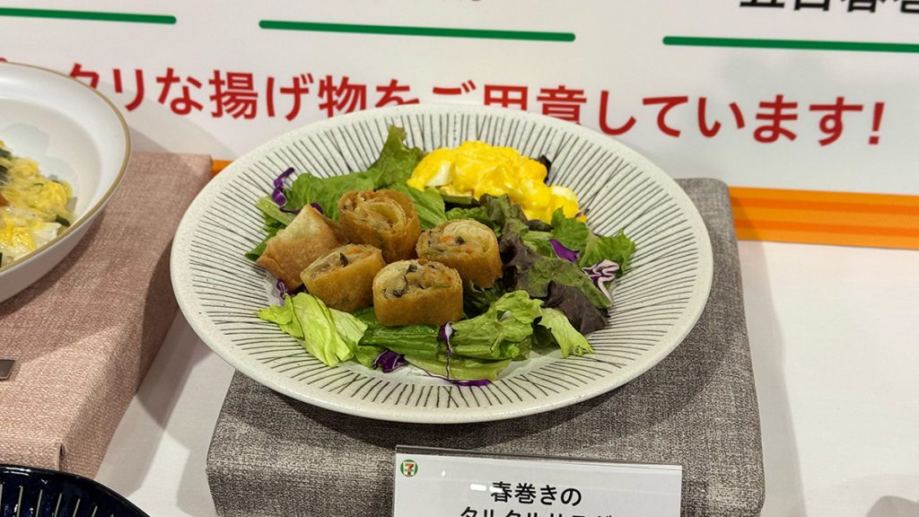 一口サイズに切った春巻きをレタスサラダの上に乗せ、セブン-イレブンの「たまごサラダ」をタルタルソースに見立てて添えた、ボリューム満点のサラダ。中華と洋風の意外な組み合わせが楽しめる。