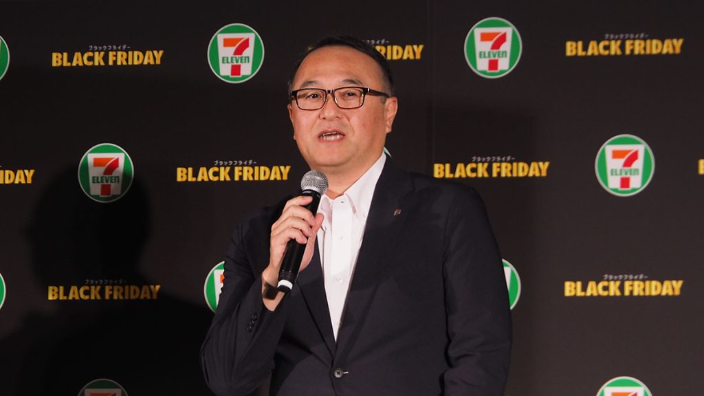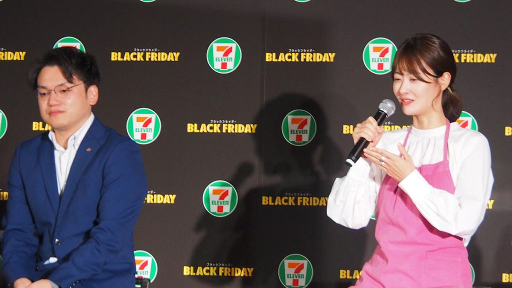 発表会の冒頭、商品本部マーチャンダイザーの戸谷駿介さんが登壇し、ブラックフライデー全体施策について説明した。国内で年々注目度が高まるブラックフライデー商戦に対し、セブン-イレブン・ジャパンは「期間限定商品」と「セール」の二本柱で本格参入するという。