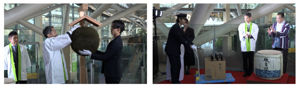 セレモニーの冒頭では、酒の神様を祀り、杉玉発祥の地とされる奈良県の大神(おおみわ)神社で本イベントのために制作された杉玉が取り付けられた。その後、静岡県焼津市から東海道新幹線で輸送されたばかりの真新しい「磯自慢」が、JRの駅員の手によって運び込まれた。