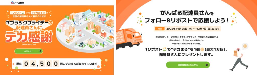 キャンペーンサイトは、温かみのあるイラストタッチを用い、街を駆け巡る配達員の姿が描かれている。投稿数に応じて寄付される「デカまる」の数が増えていく仕組みも用意されており、参加者が「自分の行動が誰かの癒しにつながる」ことを視覚的に実感できるデザインとなっている。数字が増えていく演出は、寄付型キャンペーンとしての透明性を高めるだけでなく、応援の輪が広がる様子をリアルタイムで感じられる点が特徴だ。年末商戦を支える配達員を、街全体で後押しするような雰囲気が伝わってくる。
