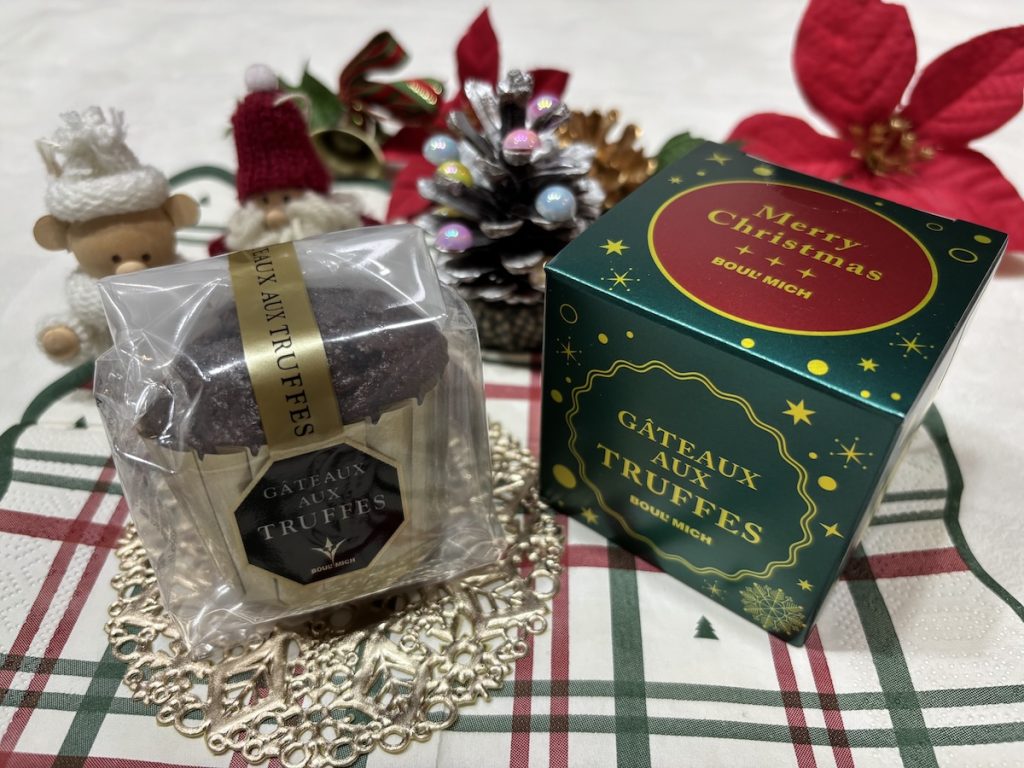 世界食品コンテスト モンド・セレクション25年連続金賞受賞。濃厚なショコラ生地にトリュフ・オ・ショコラが贅沢にもまるごと一粒入ったトリュフケーキ。ブールミッシュの看板商品でもあるトリュフケーキが、今年は緑がメインカラーのクリスマス限定パッケージとなって登場。