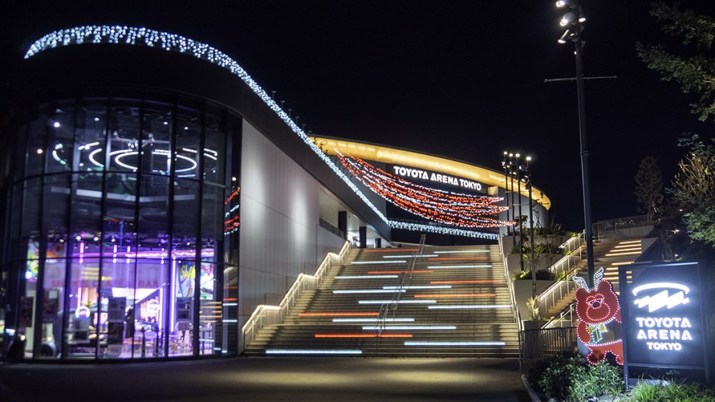 中でも注目は、今年秋にオープンしたばかりの「TOYOTA ARENA TOKYO」だ。アリーナ入り口の大階段には、アルバルク東京のクラブカラーである「赤」を中心としたイルミネーションを設置。公式マスコットの「ルーク」もトナカイに変装して来場者を出迎える。
