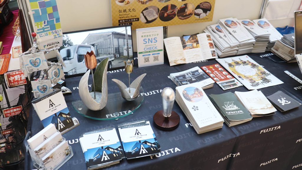 高岡はものづくりの街であり、展示された株式会社フジタの金属製品は、表札やシフトノブまでオーダーメイド可能。工場見学を含む体験プランも用意されている。