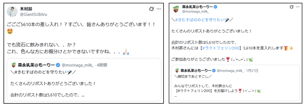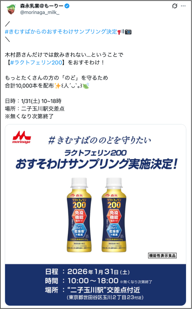 結果発表の投稿を受けて、差し入れの規模感に触れながら「どうせなら僕だけじゃなくて、みんなにも飲んでもらいたい」といった趣旨で反応。この想いを受け、森永乳業が“おすそわけ”という形での街頭サンプリングを決定した。