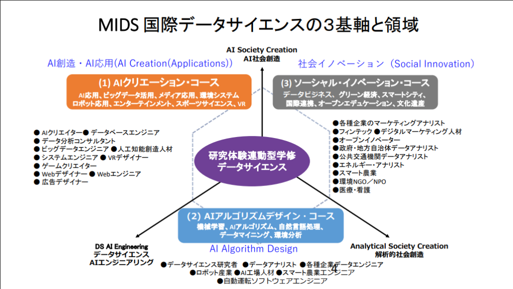 また、データサイエンティストに必要な力を身に付けるため、学部生は「AIクリエーションコース」「ソーシャルイノベーションコース」「AIアルゴリズムデザインコース」という専門コースのうち2つをメインとサブのコースに設定。遠隔教育の利点を活かし、最新の多言語化システムを用いて国際的な研究・教育の場を創出し、早い段階で国際研究の場にリーチできるチャンスを設けるほか、他大学のカリキュラムと連動したダブル・ディグリー・プログラムを行うことも大きな特徴だ。