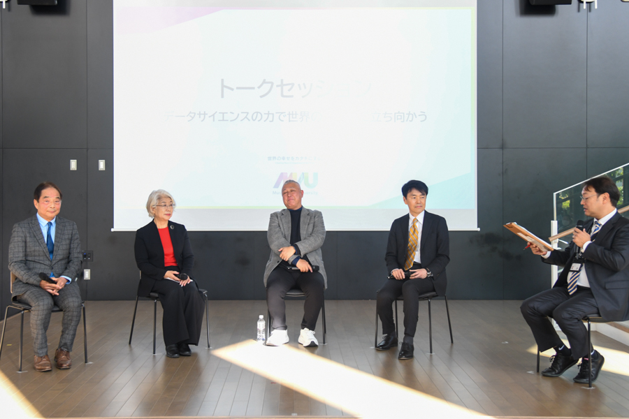 学部紹介に続いて行われたトークセッションでは、同大の小西聖子学長、清木氏に加え、デジタル庁参事官の浅岡孝充氏、株式会社CustomerPerspective代表取締役の紣川謙氏をゲストに招き、「データサイエンスの力で世界の諸課題に立ち向かう」というテーマのもと、新学部設置の狙いや期待が語られた。
