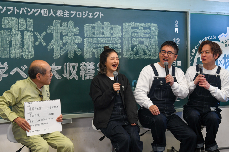 ソフトバンク株式会社が主催する「ソフトバンク個人株主プロジェクト かぶ×株農園 学べる大収穫祭」が2月12日に東京・世田谷区のART FARM IKEJIRIで行われ、農園長に就任した将棋棋士で個人投資家の桐谷広人のほか、ゲストとしてタレントのみちょぱこと池田美優とお笑い芸人のなすなかにしが登場した。旧中学校の校舎をリノベーションした会場では、桐谷がNISAに興味を持つゲストの3人に投資の知識を指南。最後には実際の農園でかぶを収穫するパフォーマンスも披露され、一般の個人株主も参加する中、ユニークな形の交流が図られた。