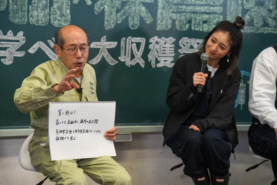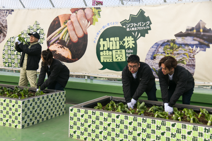 後半は、桐谷園長とゲストの2組が、実際の「かぶ×株農園」でかぶの収穫体験を実施。ここでも桐谷園長が会場の掛け声よりも早くかぶを引き抜いてしまうというハプニングを起こして和やかな空気を生み、最後は個人株主とソフトバンク社員も参加して、みんなで収穫を楽しんだ。