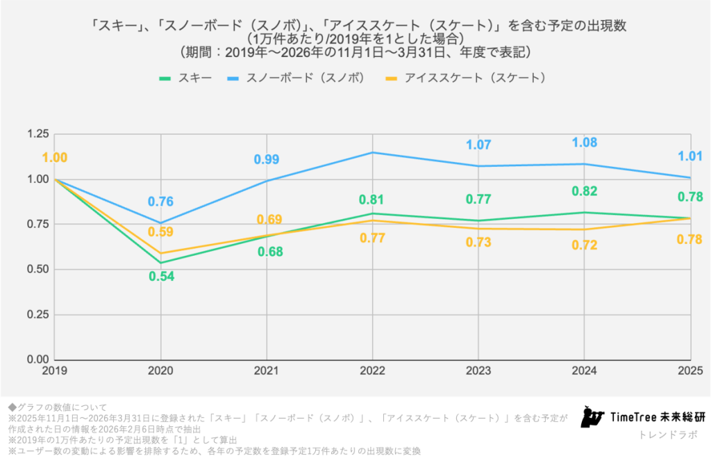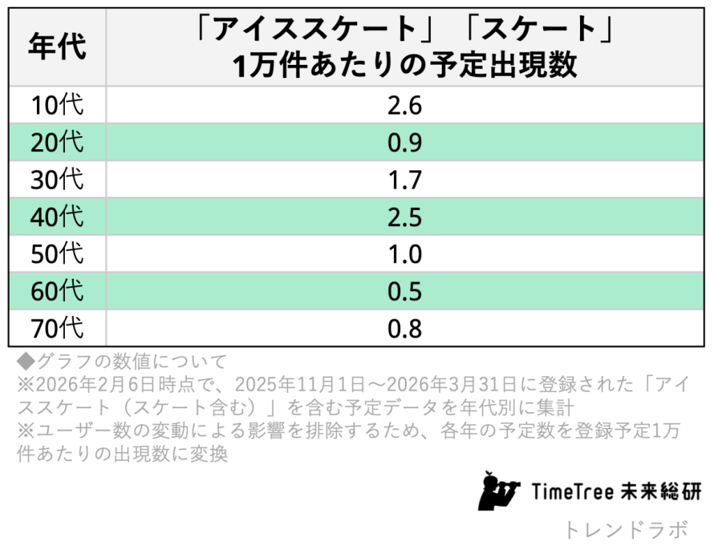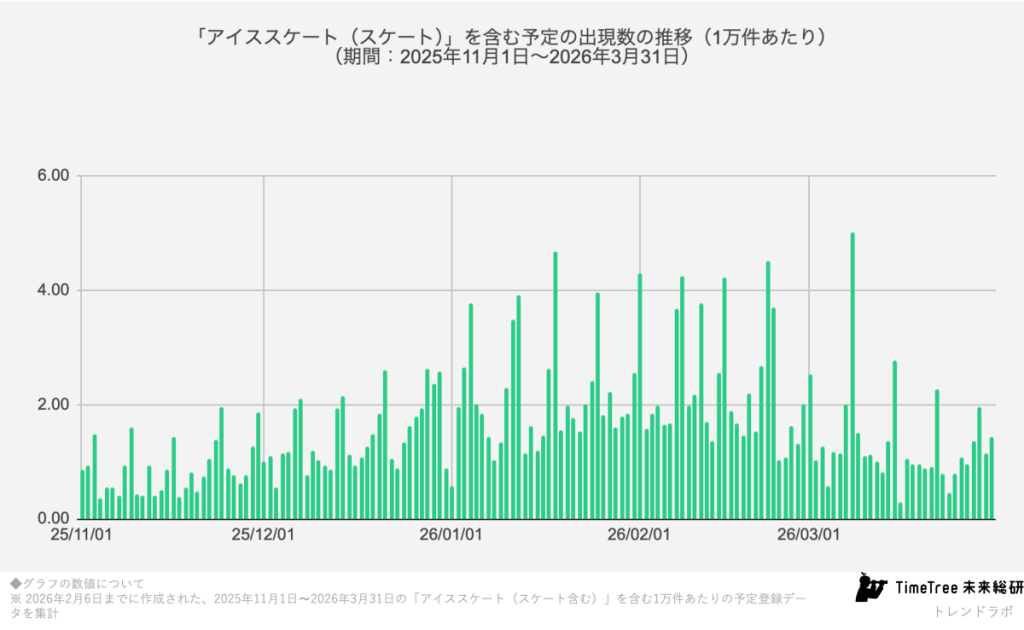 ウィンタースポーツと聞けば、多くの人は白銀のゲレンデを思い浮かべるだろう。しかし、予定データという“生活の足跡”から見ると、その風景は少し異なる。カレンダー共有アプリを展開する株式会社TimeTreeの社内研究所「TimeTree未来総合研究所」が実施した予定データ分析では、スキーやスノーボードに加え、アイススケートが世代をまたいで存在感を高めている実態が浮かび上がった。特に10代と40代という一見接点の少ない世代に支持が広がっている点は興味深い。近年はフィギュアスケート人気の持続に加え、アニメ『メダリスト』のヒットなど、氷上スポーツを物語として楽しむ文化も広がっている。こうした社会的文脈と予定データの動向は無関係ではないだろう。