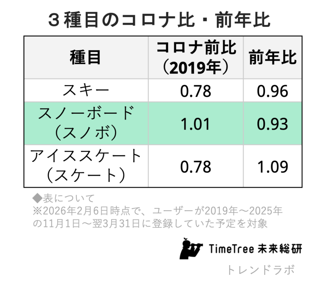 今シーズンの予定データを2019年(コロナ前)と比較すると、3種目の回復状況にははっきりとした差がある。スノーボードは101%とコロナ前水準を上回り、完全回復を果たした。一方で、スキーは78%、アイススケートも78%にとどまっている。