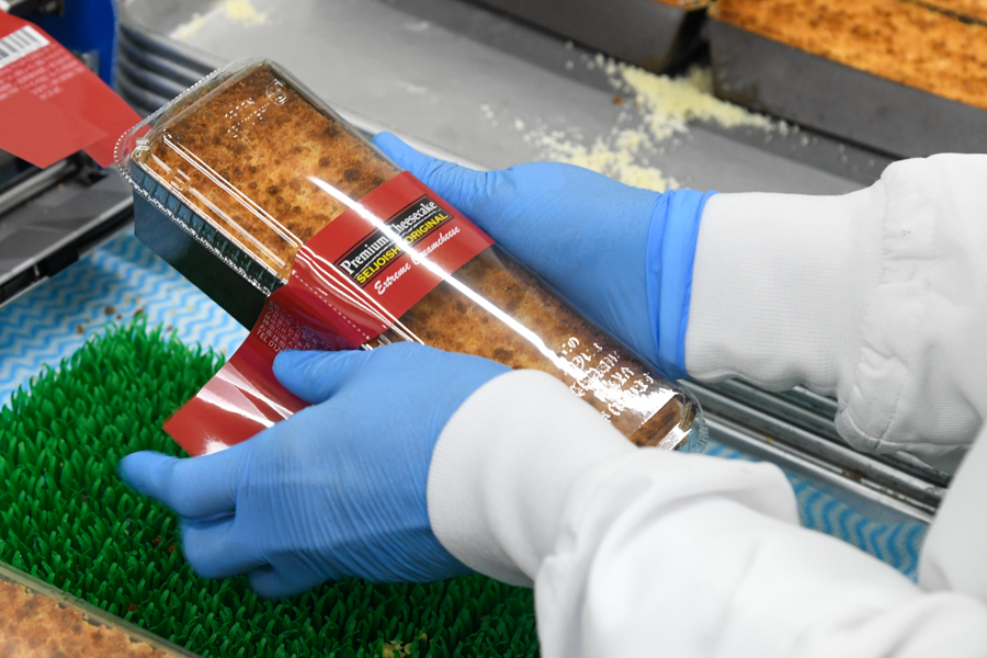続いてデザートの現場を通過し、これも不動の人気商品である『プレミアムチーズケーキ』にラベルが貼られる作業を横目に見ながらパン成形室に辿り着くと、そこでは『ごろっとマカダミアとクランベリーのもっちり湯種ベーグル』の成形が行われている最中だった。
