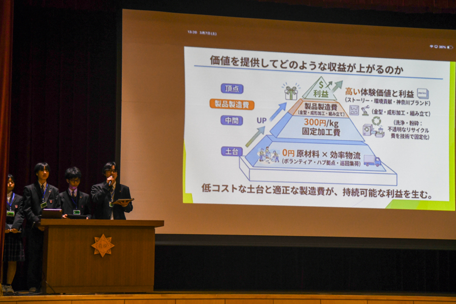 発表後の質疑応答では、永山会長から「固定加工費を1キロ300円とした場合、神奈川県の海洋ごみをすべて再生するとしたら約5億円の予算が必要になりますが、その集め方は?」という鋭い質問が。また、「このビジネスモデルを具現化するにはボランティアの方々の存在が肝になるので、地域に向けて問題意識の発信をしっかりしていくと良いのでは」と的確なアドバイスも送られた。