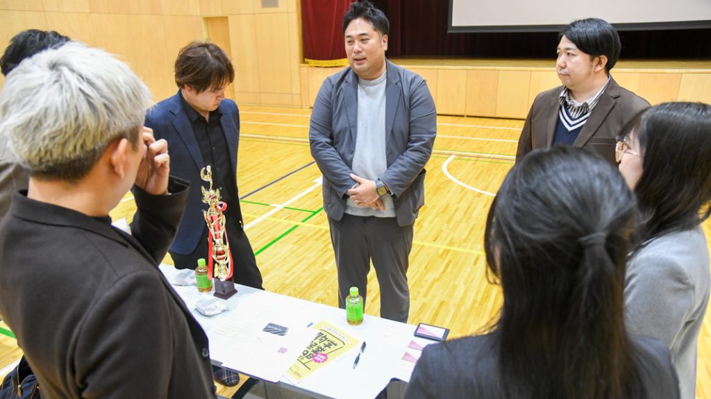 そして最後は永山会長が「今日の結果はあくまでも今日の時点での評価に過ぎません。今日まで仲間とディスカッションを重ね、いろいろ調べてきた中で、既に次にやるべきことを見つけている方もいるのではないでしょうか。何ごとも今日までの時間の上に立って明日以降を一生懸命取り組むことが最大の社会貢献に繋がると私は信じています。お互い作り上げている事業を信じて、今日からまた一緒に頑張っていきましょう」と総評を述べて全体が終了。熱い戦いの後の会場には、一年のプログラムをやり切り、お互いの健闘を認め合う生徒たちと金井氏、五十嵐教諭ら関係者の笑顔が溢れていた。