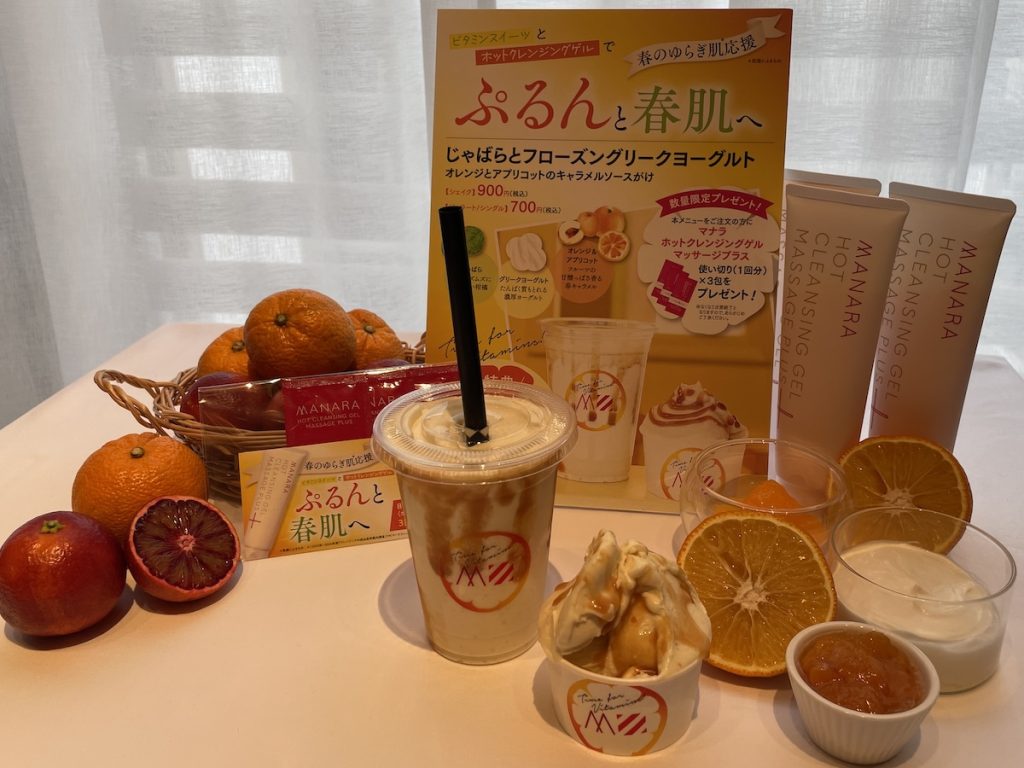 今回のコラボでは、食べることで体の内側から整えるインナーケアと、マナラのスキンケアによる外側からのアプローチを組み合わせた、春夏の新しい美容体験を提案。コラボメニューには、春特有の不調に着目し、体の内側から整えることを意識したジェラートとシェイクが開発された。使用されているのは、花粉の季節に注目される柑橘の「じゃばら」や、栄養価の高いグリークヨーグルト(水切り製法の濃縮ヨーグルト)、さらにブラッドオレンジやアプリコットといった美容に嬉しい食材だ。