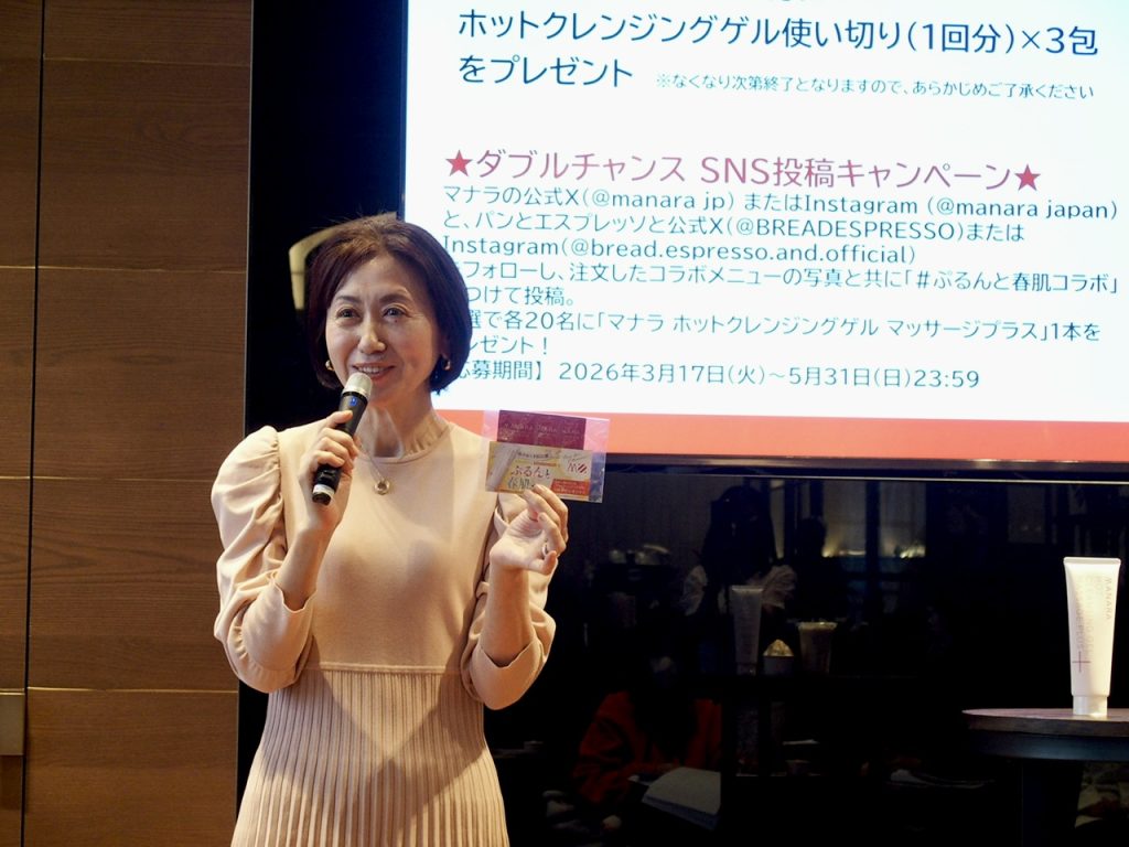 マナラの公式X(@manara_jp)またはInstagram(@manara_japan)と、パンとエスプレッソと公式X(@BREADESPRESSO)またはInstagram(@bread.espresso.and.official)をフォローし、注文したコラボメニューの写真と共に「#ぷるんと春肌コラボ」をつけて投稿。抽選で各20名に「マナラ ホットクレンジングゲル マッサージプラス」1本をプレゼント。