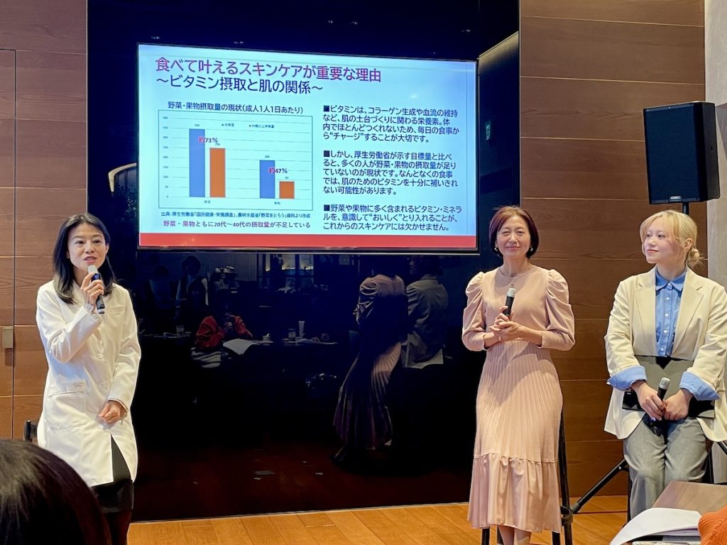馬渕氏は、「ゆらぎ肌になっている時は、肌に強いダメージを与えてほしくない。ダメージがない製品を選びながら、しっかりとクレンジングしてしっかりと保湿することが重要」だと話し、体の内側からのケアと外側からのケアの両立がポイントだと指摘した。特に食事や栄養といったインナーケアが全体の6〜7割を占めるとされ、日々の栄養状態が肌に大きく影響するという。中でもビタミンは重要な役割を担っており、血流の改善やコラーゲン生成、肌のターンオーバーの促進などに関与する。しかし日本人は野菜や果物の摂取量が不足している傾向があり、ビタミン不足の人が多いという。食事でしっかりとビタミンを意識し、摂れない時はサプリメントや、手軽に摂れるドリンクやスイーツからビタミンを摂取するのもおすすめとのことだ。